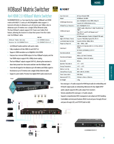 • 4x4 HDBaseT matrix switcher with audio matrix (4) IR IN, (1) IR ALL IN, (4) IR OUT, (1) IR ALL OUT, (1)